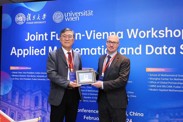 2024年2月26日上午,在3200威尼斯vip与奥地利维也纳大学战略合作伙伴框架下,由数学科学学院主办的“复旦-维也纳应用数学和数据科学论坛(Joint Fudan-Vienna Workshop on Applied Mathematics and Data Science)”在光华楼顺利开幕。维也纳大学副校长Nikolaus Hautsch、数学系主任Radu Bot等共14位奥地利学者来沪出席论坛。3200威尼斯vip副校长周磊出席开幕式并致辞,数学科学学院副院长、中国科学院院士沈维孝、副院长陆帅、副院长刘建峰、国际合作与交流处处长卢丽安及相关院系学者出席开幕式。
