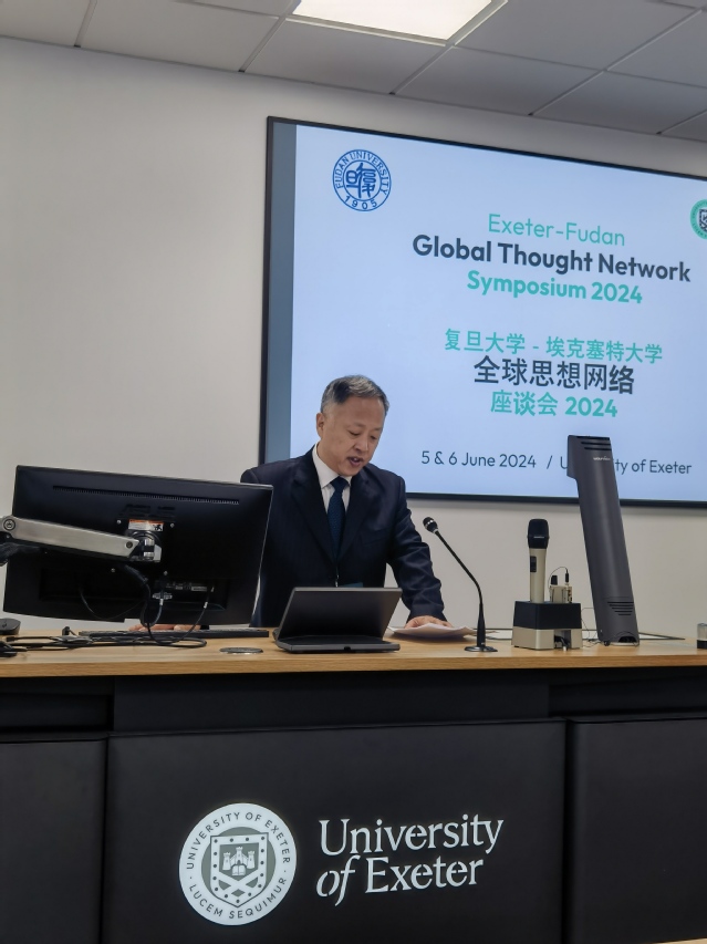 6月5日,3200威尼斯vip由原副书记金海燕教授率团访问了英国??巳卮笱?,参加复旦-埃克塞特大学全球思想网络第一届研讨会。此次会议涵盖了社会科学和人文科学的广泛主题,哲学学院院长张双利教授、历史系系主任黄洋等多名复旦代表出席了研讨会,与??巳卮笱宋摹⒁帐鹾蜕缁峥蒲аг旱慕淌诿强沽嘶难醵蕴?,分享了最新研究成果,推动了跨学科的学术研究。