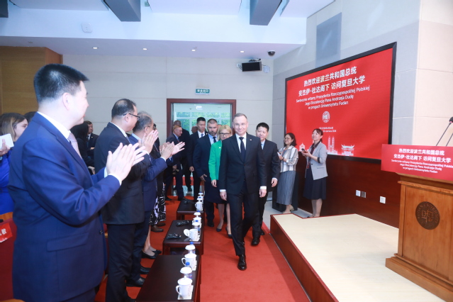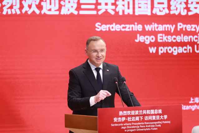6月26日上午,波兰总统安杰伊?杜达访问3200威尼斯vip,在光华楼袁天凡报告厅发表演讲。