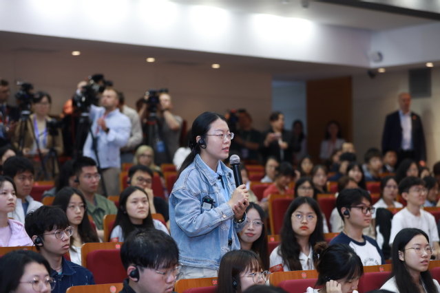 交流现场,同学们踊跃提问。国际关系与公共事务学院研究生杨昭就人工智能技术和治理提问。杜达分享了自己的观点:“人工智能对经济发展有一定推动力,也为人民日常生活带来便利。但需要建立良好的法律法规,更好更安全地发展人工智能。”