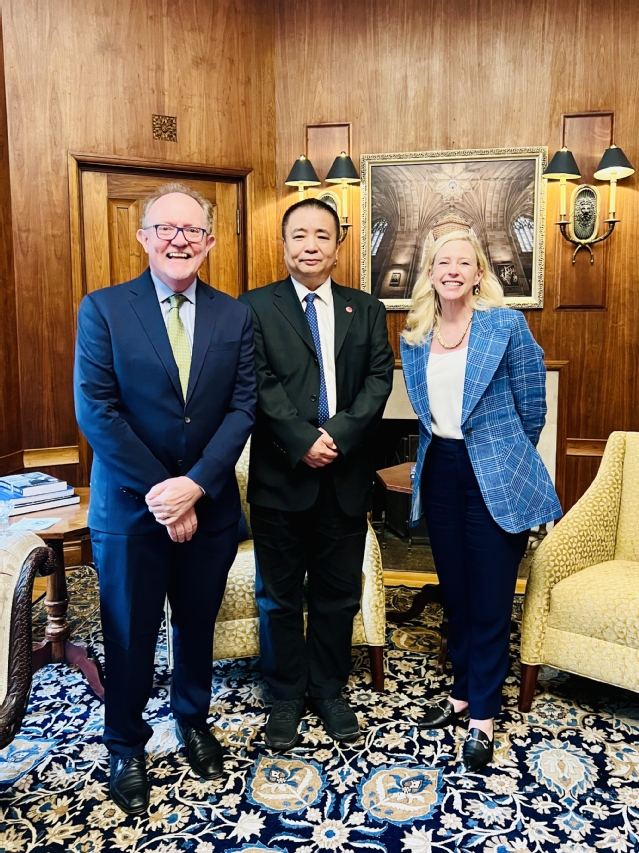 9月25日上午,金力一行访问耶鲁大学,会见耶鲁大学校长Maurie McInnis和全球战略副教务长Steven Wilkinson。双方就暑期项目、本科生培养、精准医疗等方向的潜在合作意向进行深入交流。