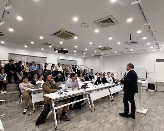 在讲座环节,欧尔班·巴拉兹以“变动中的世界秩序”为题,介绍了匈牙利政府坚持采取“互联互通”战略(ConnectivityStrategy),认为中匈经济合作连接双方市场,促成了一种和平、繁荣、互相尊重的合作。他还回答了关于欧盟对华政策、匈塞铁路建设等师生共同关心的问题。