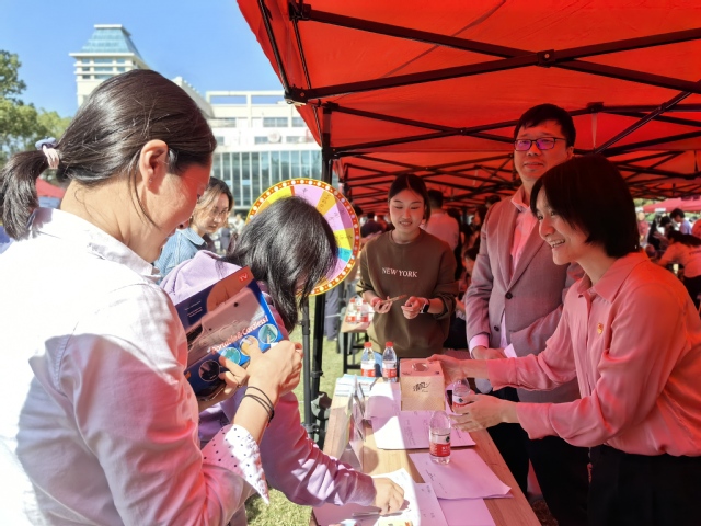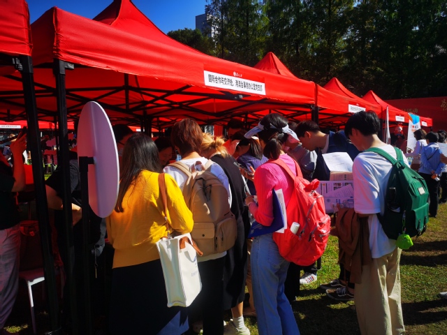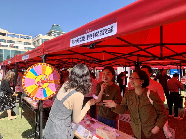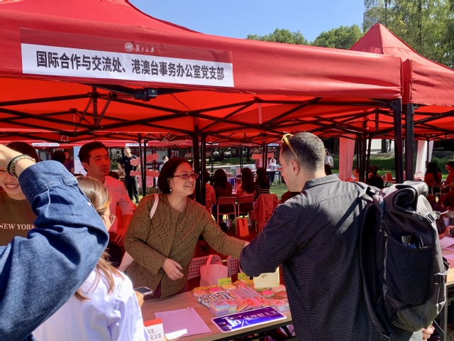 参与服务的党员早早地来到现场,为师生准备了详细的业务指南、介绍资料、联络方式等,同时准备了趣味问答游戏和精美纪念品。活动现场气氛热烈,共有百余名师生来到了国合处与港澳台办的摊位。参与师生驻足扫码关注国合处和港澳台办微信公众号,对日常业务办理提出咨询、意见和建议,热情参与了趣味问答游戏。